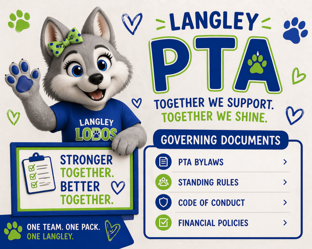Langley PTA supports the mission and purpose of the Texas PTA by operating with transparency, consistency, and integrity through our governing documents. Our bylaws and standing rules provide the foundation for how we function—outlining leadership roles, guiding decision-making, and ensuring alignment with PTA standards. You’ll find our governing documents, which outline everything from leadership structure to financial practices and committee responsibilities. Together, these documents help ensure continuity, accountability, and a smooth experience for our members and volunteers.